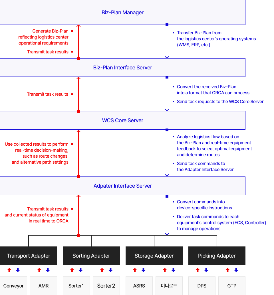 - Adapter Interface Server : Bridges WCS and ECS, delivering executable commands to each piece of equipment.